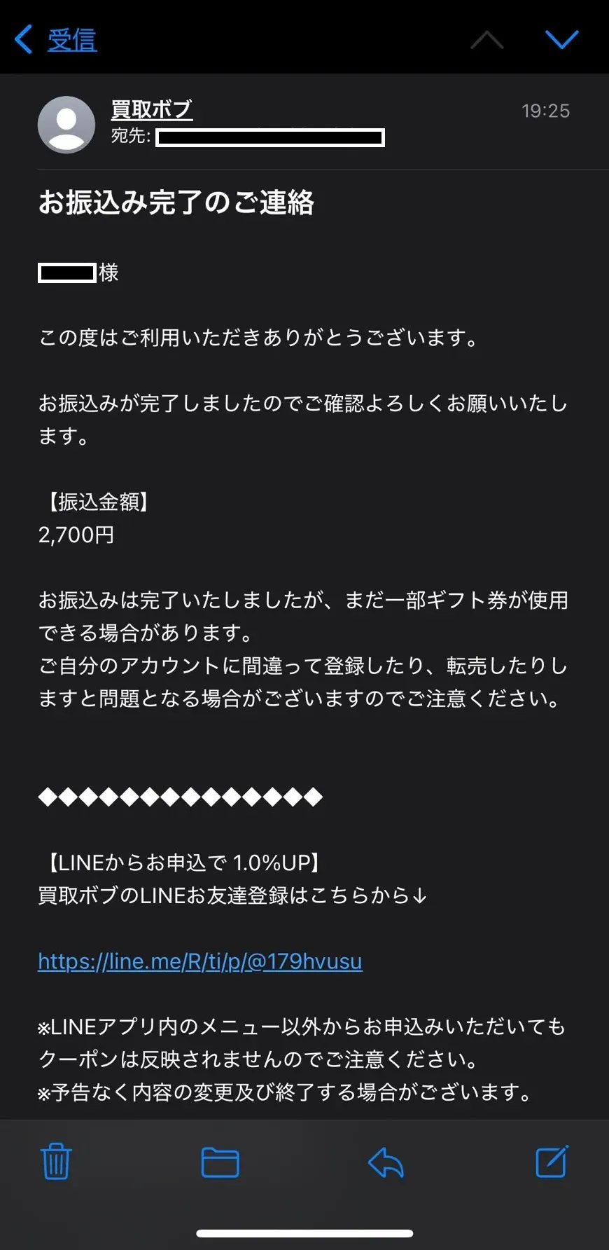 振込完了後にメールを送ってくれるので親切だなと思います。一度ギフト券の番号を間違えて申し込んでしまったことがあるのですが、メールで連絡したところすぐに対応してくれて大きなトラブルにならずに済みました。