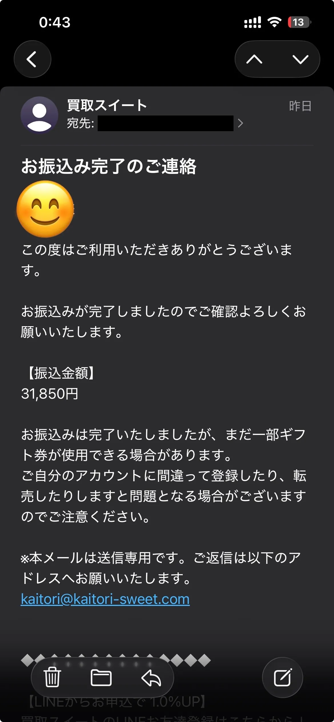 この度は当サイトをご利用いただき誠にありがとうございます。振込の早さや買取率、サポート体制までご評価いただき大変光栄です。初めての方にも安心しておすすめできるとのお言葉を励みに、今後も信頼される運営を続けてまいります。